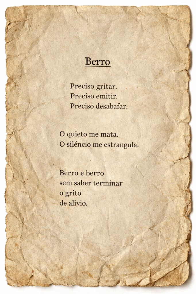 Alguém — me salve, me lave a alma. Alguém — me seja, me torne larva. Alguém — me retire, me vire do avesso. Alguém — me jogue nas águas dos medos.